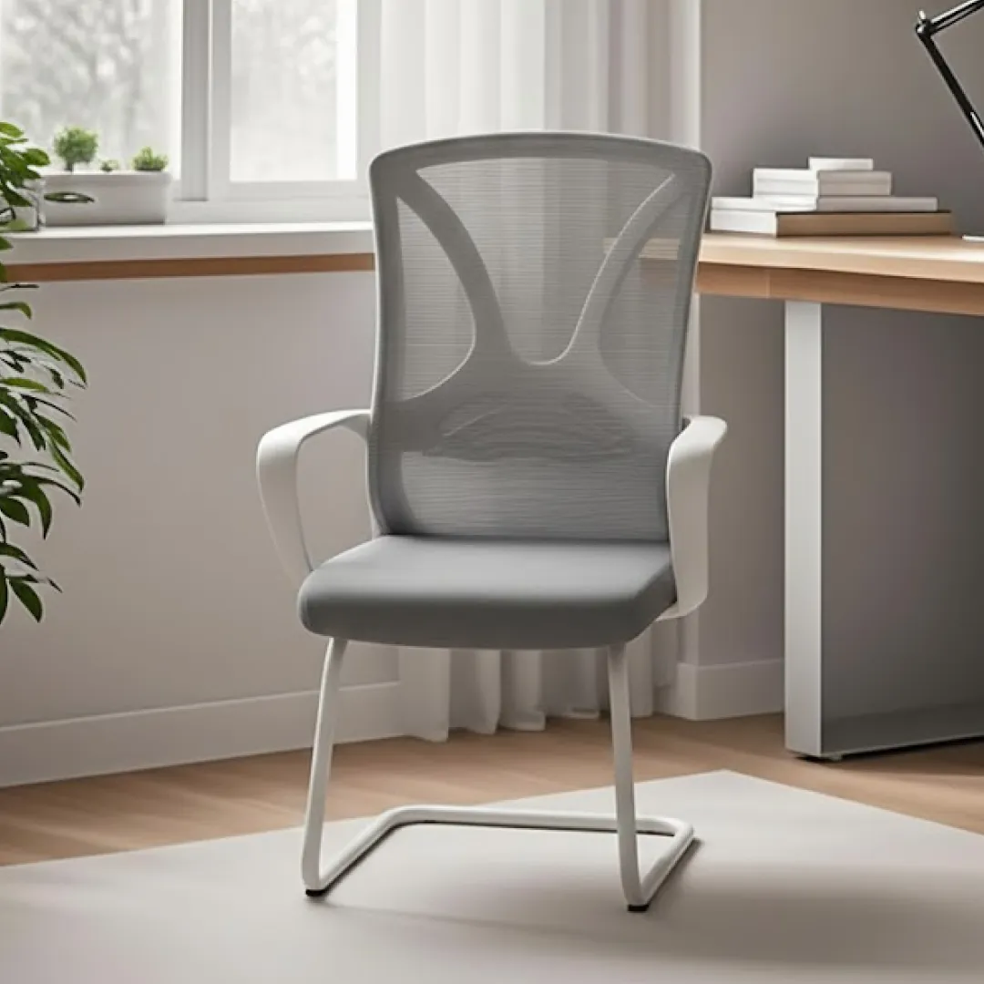 Aesthetics: Contemporary style combining mesh texture with sleek white plastic/ metal elements.